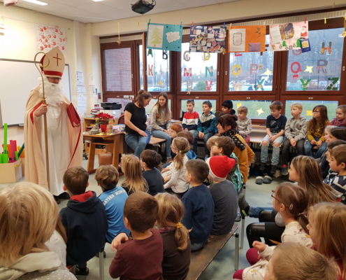 In ehrfürchtige Gesichter blickte der Nikolaus, als er die Kinder der Grundschule St. Martin besuchte. Diese empfingen den heiligen Mann mit Liedern, Gedichten und Geschichten.